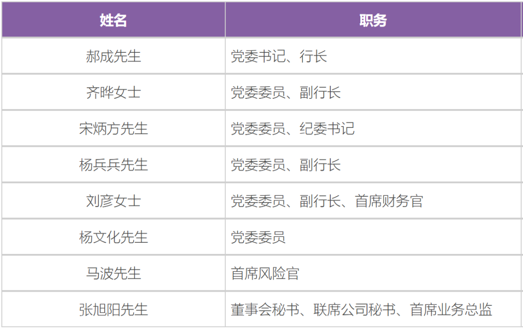 目前,光大银行高管成员包括:党委书记、行长郝成;党委委员、副行长齐晔;党委委员、纪委书记宋炳方;党委委员、副行长杨兵兵;党委委员、副行长、首席财务官刘彦;党委委员杨文化;首席风险官马波;董事会秘书、联席公司秘书、首席业务总监张旭阳。