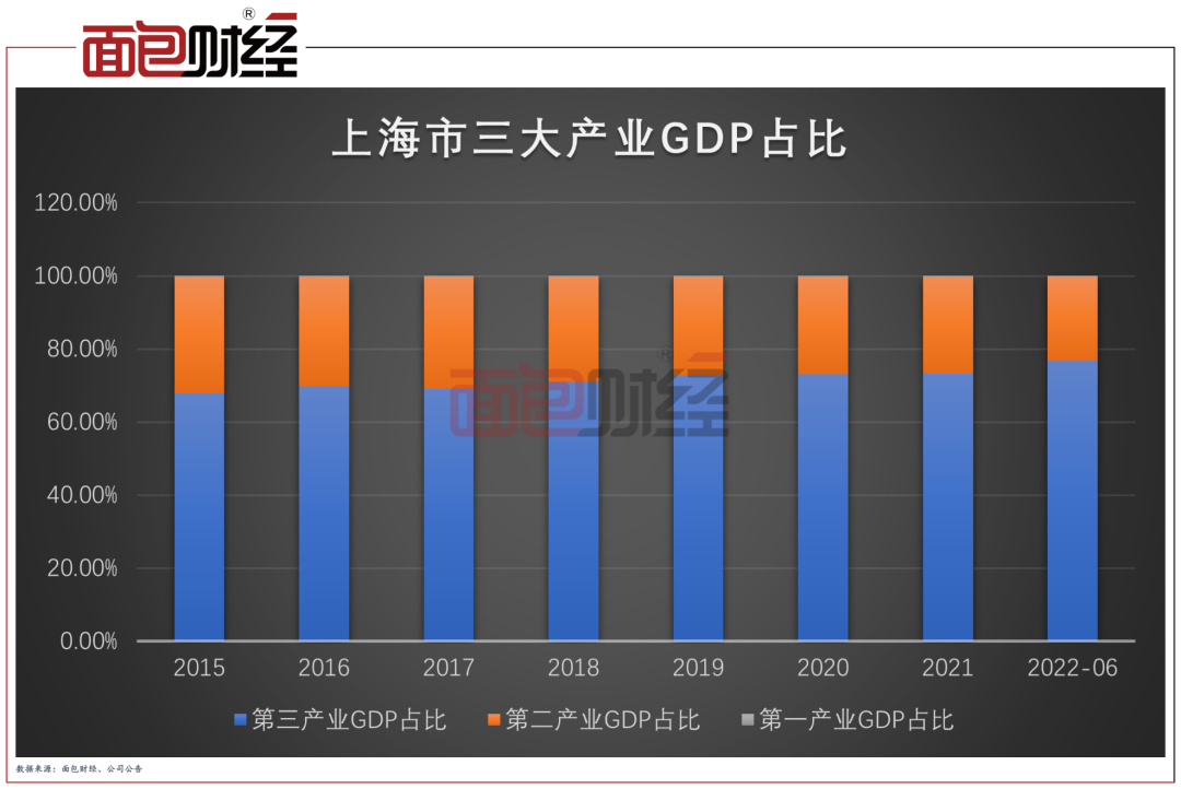 上海统计局数据显示,2021年及2022年上半年,上海市第二三产业GDP合计占上海市总GDP的99%以上。第一产业在全市GDP中的占比长期低于0.5%。