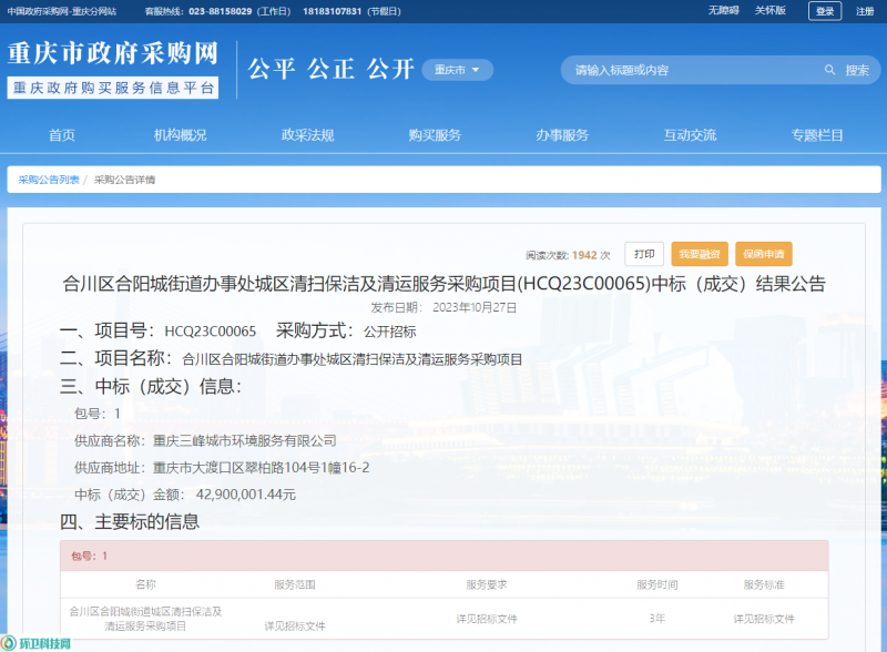 10月27日重庆市政府采购网发布合川区城区清扫保洁及清运服务采购项目中标公告,重庆三峰城市环境服务有限公司以4290万元的报价金额中标,服务期三年。