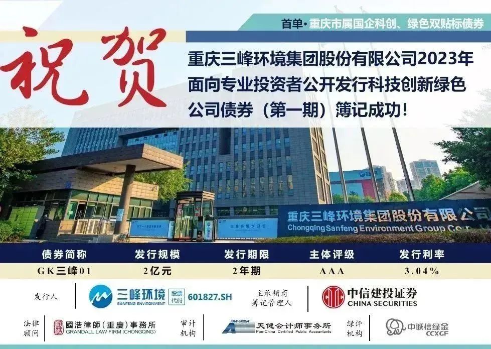 近日,三峰环境在上海证券交易所完成2023年面向专业投资者公开发行科技创新绿色公司债券(第一期)的簿记发行,成为重庆市属国企首单“科技创新”和“绿色”双贴标产业类公司债券。