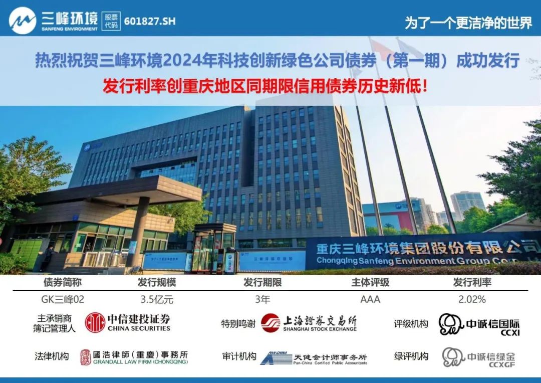 近日,三峰环境集团顺利完成簿记,并面向专业投资者成功发行科技创新绿色公司债,发行规模3.5亿元,期限3年。票面利率2.02%,认购倍数4倍,利率创重庆地区同期限信用债券历史新低。