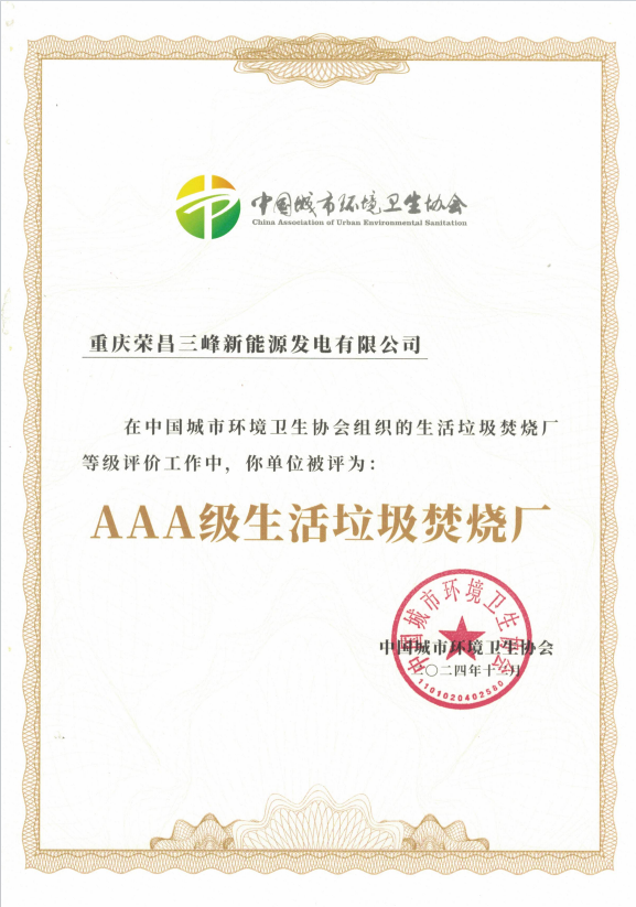 近日,荣昌三峰公司顺利通过中国城市环境卫生协会组织的生活垃圾焚烧厂等级评价,获评“AAA级生活垃圾焚烧厂”。这也是三峰环境集团旗下第9座获此殊荣的生活垃圾焚烧发电厂。