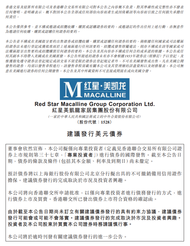 公告显示,红星美凯龙拟仅向专业投资者发行美元债券,所得款项净额用于偿还现有的有息债务。截至公告日,债券的条款及条件(包括其本金额、利率及到期日)尚未确定。