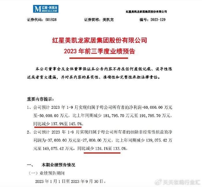 10月23日讯,红星美凯龙家居集团股份有限公司(美凯龙,601828.SH)发布2023年前三季度业绩预告。