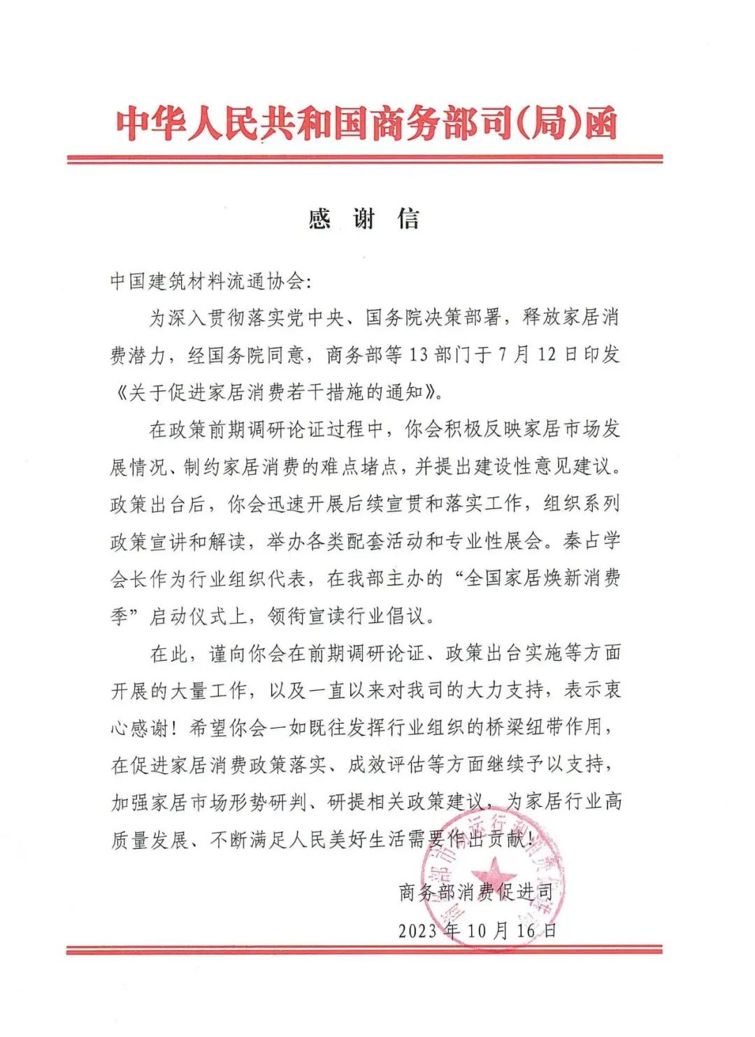 在商务部等13部门《关于促进家居消费若干措施的通知》出台前期的调研论证以及后期的贯彻落实过程中,红星美凯龙积极配合中国建筑材料流通协会,参与建言献策,为政策的出台和落实,做出了积极努力。