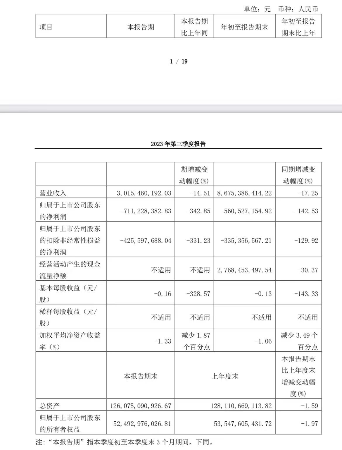 根据公告,前三季度,公司实现营业收入86.75亿元,同比减少17.25%;归属于上市公司股东的净利润为-5.61亿元。