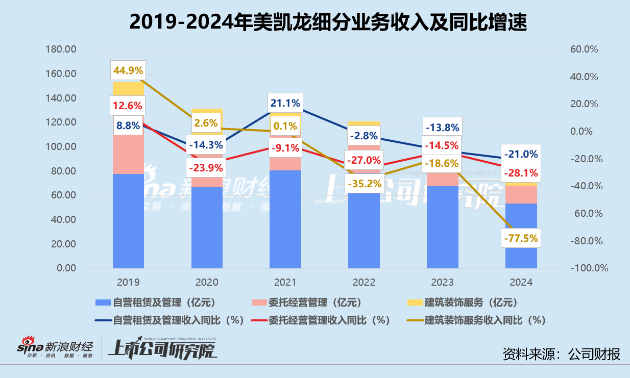 就细分业务而言,报告期内,美凯龙面向商户的自营及租赁收入首次降至60亿元以下,同比骤降21.0%,对总营收贡献接近七成;委托经营管理收入较2023年减少28.1%至14.60亿元,与2019年的47.02亿元相去甚远,占总营收比例维持在18.7%;建筑装饰服务更是因为房地产行业下行,新增项目减少、存续项目工程进度放缓,导致收入锐减77.5%至3.32亿元,占比低至4.2%,同比减少9个百分点。