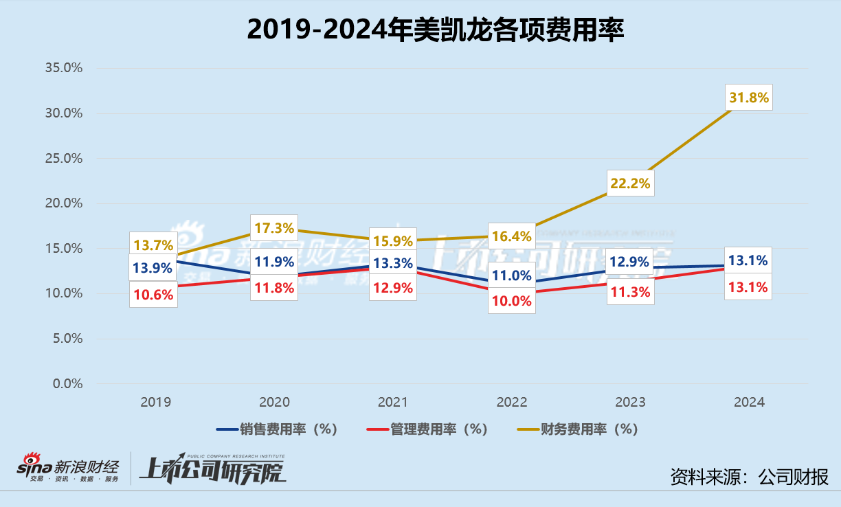 从费用管控的层面来看,2024年公司由于商场出租率阶段性下降,单位面积营销成本增加,线下广告及宣传费用规模虽然同比节省2.77亿元,但销售费用率微增0.3%至13.1%。财务费用率再创新高突破30%,利息支出高达25.32亿元,约占当期总营收32.4%。相较其他家居卖场公司,美凯龙因有息负债规模长期维持高位,财务费用常年在25亿元左右,费用率一直徘徊在15%-20%之间,而居然智家的财务费用率始终不超过10%。