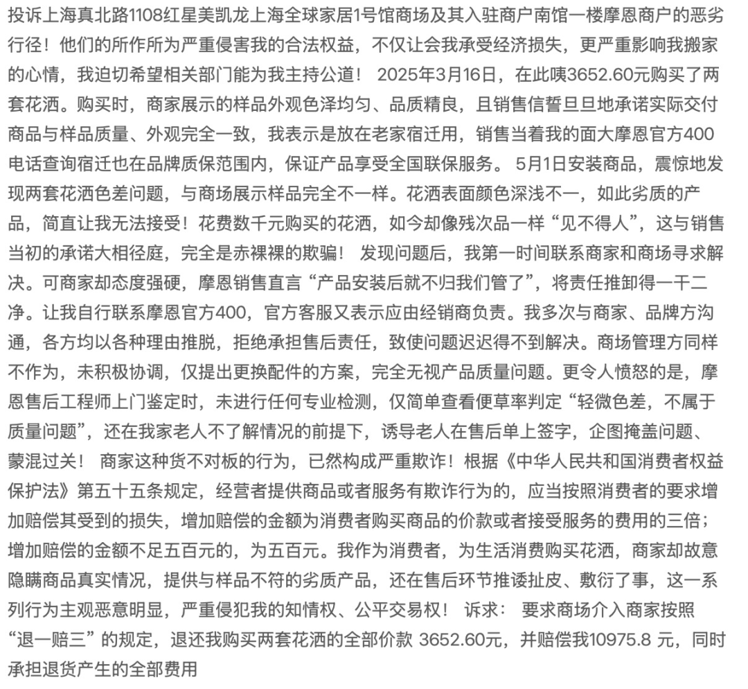 还有网友投诉产品存在质量问题,在红星美凯龙购买的花洒色差很大,但是商家却又推诿不肯承担责任。