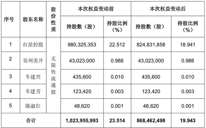 根据重整计划,红星控股持有的公司约1.55亿股股票(占公司总股本的3.57%)将全部直接以抵债形式向普通债权人进行分配。分配完毕后,红星控股持有的公司股份将从约9.8亿股减少至约8.25亿股,持股比例由22.51%降至18.94%,红星控股及其一致行动人合计持股比例将从23.51%下降至19.94%。上述权益变动后,红星控股原实际控制人车建兴(即车建新)将不再控制红星控股。