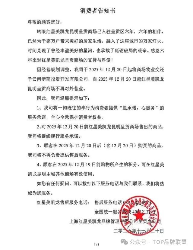 附: 红星美凯龙 昆明呈贡商场停业通知