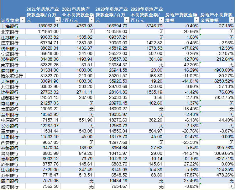 截至2021年末,30家上市城商行房地产贷款金额合计9443.88亿元,同比下降3.97%。