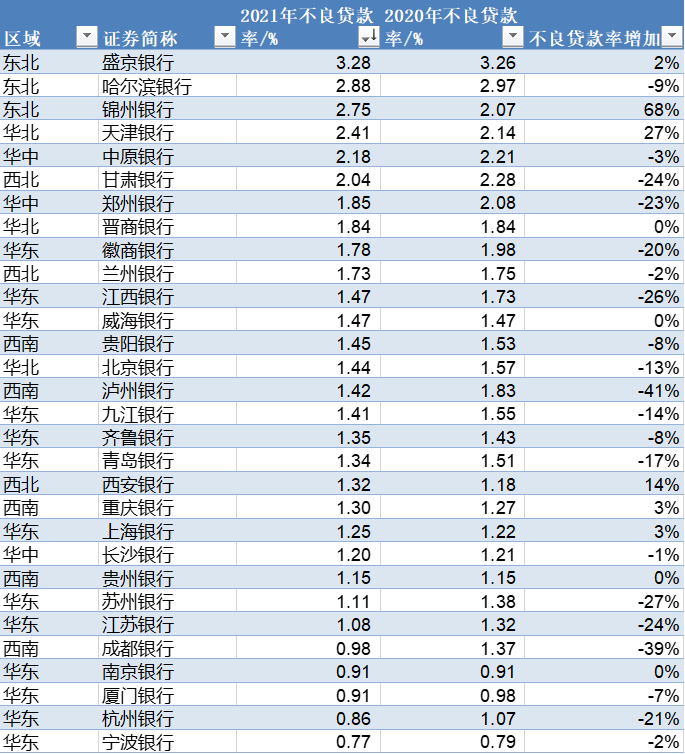 从地区来看,东北地区的盛京银行、哈尔滨银行、锦州银行2021年的不良贷款率分别为3.28%、2.88%、2.75%,是30家城商行中表现最差的3家银行,高于商业银行不良贷款率平均1.73%的水平,更远高于30家上市城商行不良贷款率平均1.56%的水平。
