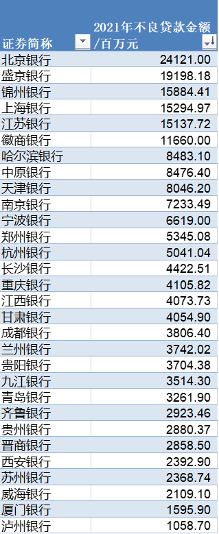 30家上市城商行中不良贷款金额排名前三的分别是北京银行、盛京银行、锦州银行,其中北京银行不良贷款金额为241.21亿元,占30家城商行合计不良贷款总额的11.86%。