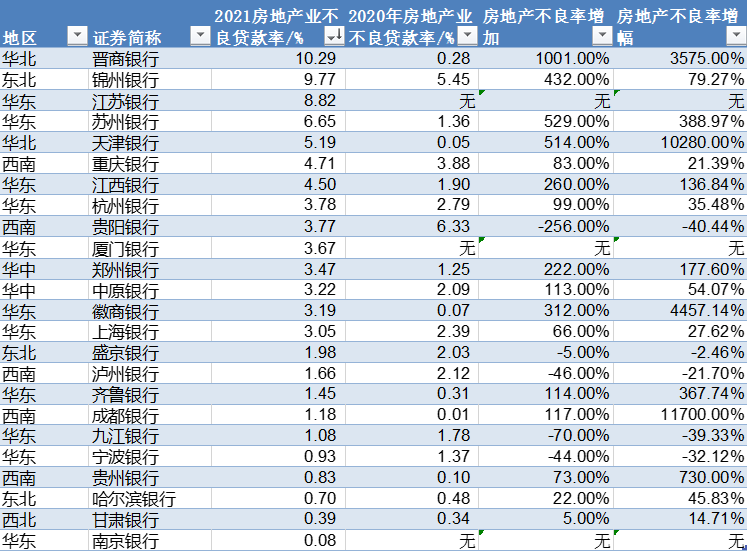 此外,截至2021年末,西南、华中、西北地区的上市城商行在房地产业不良贷款率方面的表现要优于华北、华东、东北地区。