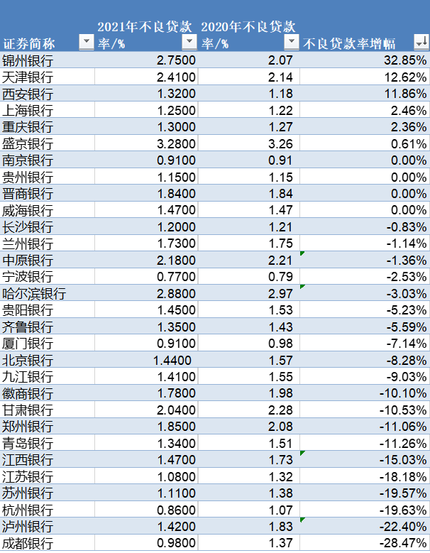 30家上市城商行中有20家银行不良贷款率同比下降,有4家与2020年末持平,有6家同比上升。从统计数据来看,不良贷款率增幅最高的前三名分别是锦州银行、天津银行、西安银行,锦州银行不良贷款率增幅达32.85%。不良贷款率降幅最大的三家银行分别是成都银行、泸州银行、杭州银行,成都银行不良贷款率降幅达28.47%。