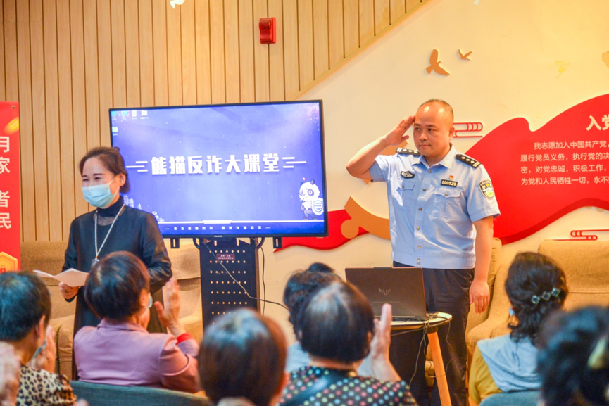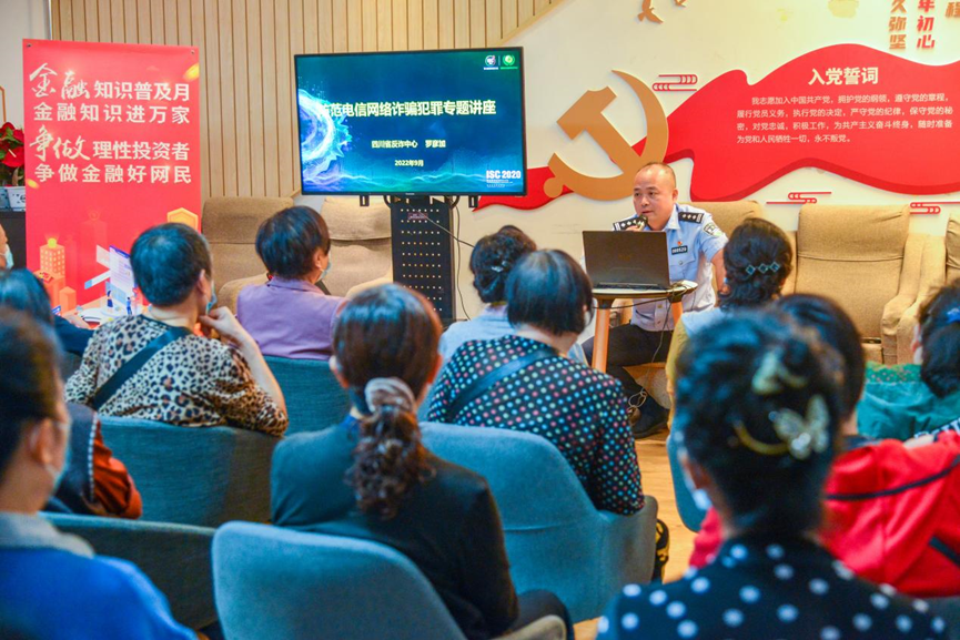 9月29日,在成都银行与成华区二仙桥街道下涧槽社区共建的“社区金融宣教基地”,成都银行推出“熊猫反诈大课堂”正式开讲第一课。大课堂上,特邀讲师四川省反诈中心综合防范支队支队长、三级高级警长罗彦加以案说法,深度还原诈骗套路,现场教授反诈知识,给社区群众留下深刻印象,现场响起一阵阵掌声。