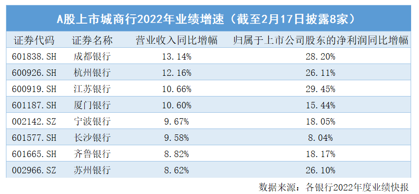 值得一提的是,截至目前,包括成都银行在内,已有8家A股上市城商行披露了2022年度业绩。在这8家银行中,成都银行营业收入增速排名第一,归属于母公司股东的净利润增速排名第二。