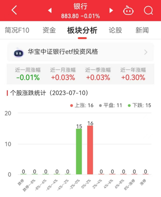 今日,银行板块整体跌幅0.01%,其中16只股票上涨,11只股票平盘,15只股票下跌。