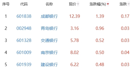 其中,成都银行、青岛银行、交通银行、南京银行、建设银行位列板块涨幅前五位,涨幅分别为1.39%、0.96%、0.52%、0.50%、0.48%。