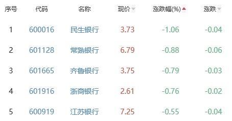 民生银行、常熟银行、齐鲁银行、浙商银行、江苏银行位列涨幅榜后五位,涨幅分别为-1.06%、-0.88%、-0.79%、-0.76%、-0.55%。