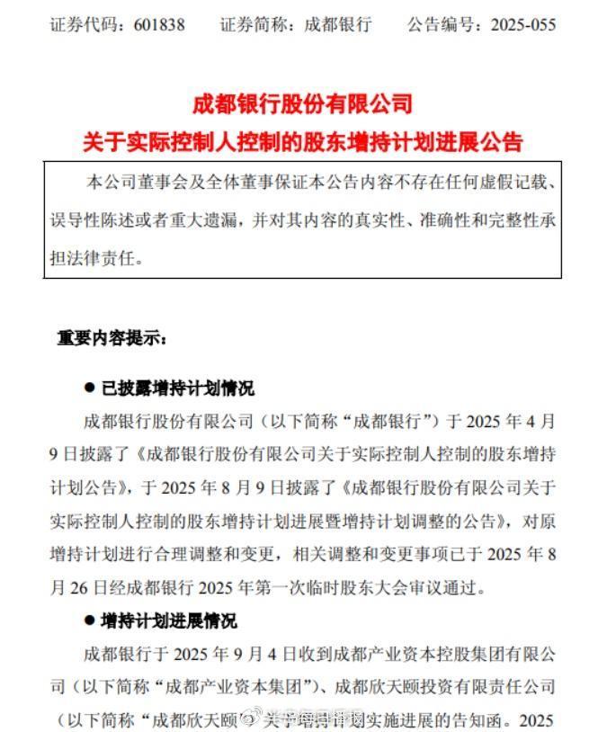 9月4日,成都银行公布股东成都产业资本控股集团有限公司(以下简称:成都产业资本集团)和成都欣天颐投资有限责任公司(以下简称:成都欣天颐)增持计划进展情况。自2025年8月27日至9月4日,成都产业资本集团通过集中竞价方式累计增持成都银行股份4775500股,占成都银行股份总数的比例为0.1127%,增持金额达8700.10万元。成都欣天颐累计增持4364492股,占成都银行股份总数的比例为0.1030%,增持金额为7959.35万元。