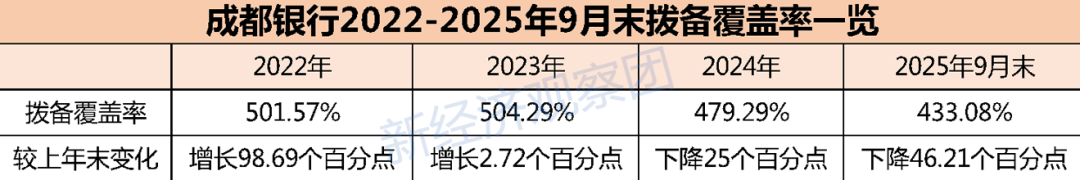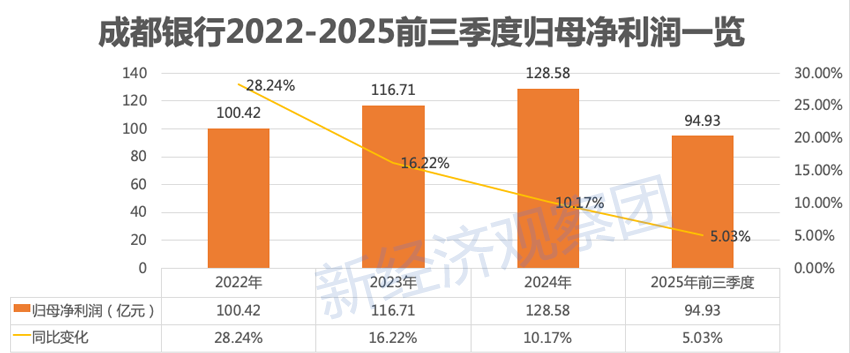 不仅如此,成都银行的归母净利润增速也在同步放缓。2022-2024年,该行归母净利润分别为100.42亿元、116.71亿元、128.58亿元,从28.24%一路降至10.17%,又在2025年前三季度录得归母净利润94.93亿元,增速萎缩至5.03%。