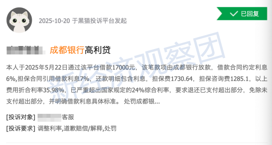 而在黑猫投诉上,有用户在10月20日投诉成都银行,在5月份与某流量平台合作的贷款中,成都银行为放款方,除了合同利率6%之外,流量平台还额外收取担保费、咨询费,合计年化利率35.98%,超出法定的24%上限。