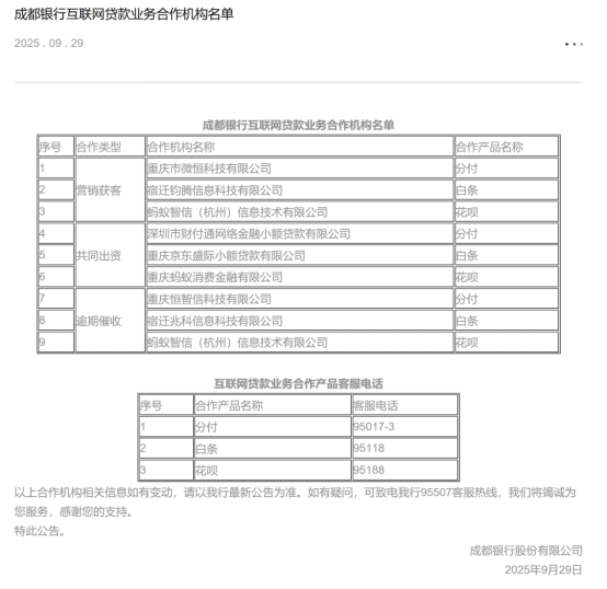 据成都银行于2025年9月发布的《互联网贷款业务合作机构名单》可见,该行与多家第三方科技公司建立了深度合作关系,主要是蚂蚁智、京东、腾讯登等头部互联网金融企业。合作产品涵盖“花呗”“白条”“分付”等主流消费信贷品牌,合作模式则分为营销获客、共同出资和逾期催收三大类。
