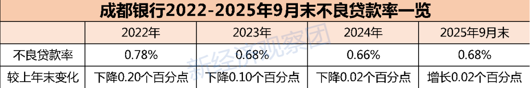 虽然业绩增速持续放缓,但成都银行的资产质量表现稳健。2022-2025年9月末,不良贷款率分别为0.78%、0.68%、0.66%、0.68%,三年多时间来并无明显增长,在众多A股上市银行中始终处于低位,堪称亮眼。