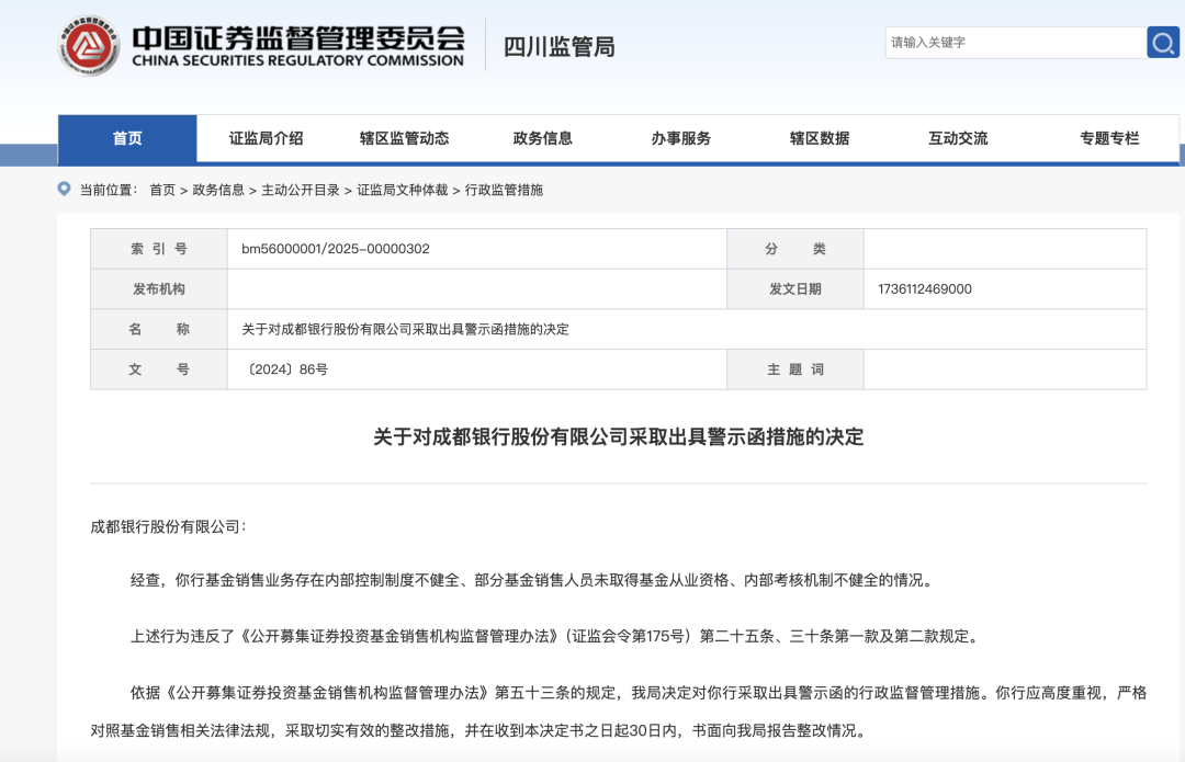 成都银行的内部治理问题近期也浮出水面。2025年1月6日,四川证监局发布公开信息显示,成都银行股份有限公司因未依法履行其他职责被出具警示函。经查,该行在基金销售业务中存在多项违规行为,包括内部控制制度不健全、部分基金销售人员未取得从业资格、内部考核机制缺失。