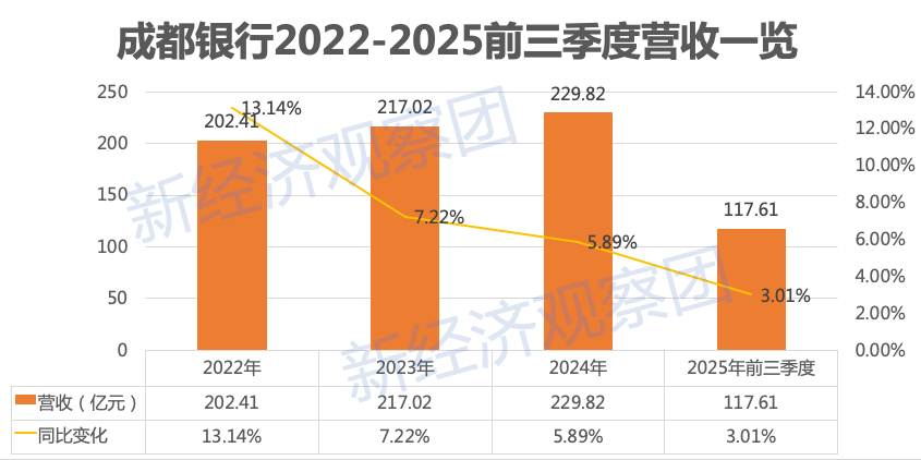 近年来,成都银行的营业收入虽仍在增长,但增速已连续三年多下滑。新经济观察团据银行财报统计,发现2022-2024年,该行实现营业收入分别为202.41亿元、217.02亿元和229.82亿元,但同比增幅却从13.14%一路收窄至5.89%。2025年前三季度,成都银行实现营收117.61亿元,同比增速已经下滑至3.01%。