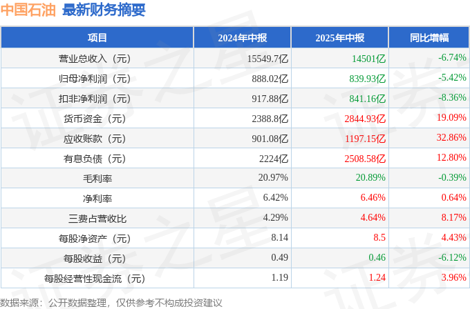 近期中国石油(601857)发布2025年中报。截至本报告期末,公司营业总收入14500.99亿元,同比下降6.74%,归母净利润839.93亿元,同比下降5.42%。按单季度数据看,第二季度营业总收入6969.91亿元,同比下降6.09%,第二季度归母净利润371.86亿元,同比下降13.59%。本报告期中国石油公司应收账款体量较大,当期应收账款占最新年报归母净利润比达72.7%。