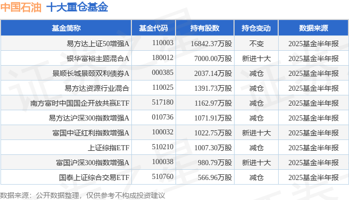 持有中国石油最多的基金为易方达上证50增强A,目前规模为164.48亿元,最新净值2.0539(8月27日),较上一交易日下跌1.67%,近一年上涨23.59%。该基金现任基金经理为张胜记。
