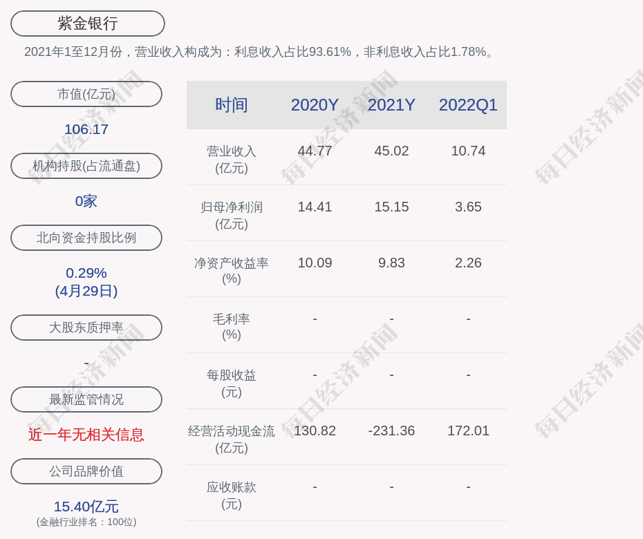 2021年1至12月份,紫金银行的营业收入构成为:利息收入占比93.61%,非利息收入占比1.78%。
