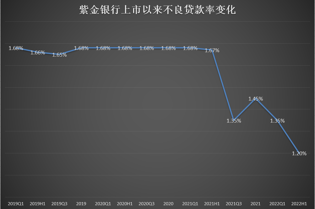 需要指出的是,自2019年年初等陆A股以来,长达两年半的时间里,紫金银行的不良率一直维持在1.65%-1.68%的相对高位区间。自2021年三季度起,不良率开始震荡下行,并于今年二季末创下上市以来新低。