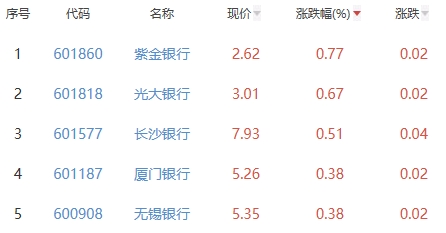 其中,紫金银行、光大银行、长沙银行、厦门银行、无锡银行位列板块涨幅前五位,涨幅分别为0.77%、0.67%、0.51%、0.38%、0.38%。