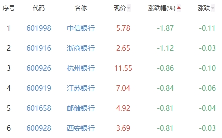 中信银行、浙商银行、杭州银行、江苏银行、邮储银行、西安银行位列涨幅榜后五位,涨幅分别为-1.87%、-1.12%、-0.86%、-0.84%、-0.81%、-0.81%。
