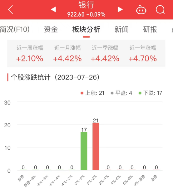 数据显示,截至今日,银行板块近一周涨幅2.10%,近一月涨幅4.42%,近一季涨幅4.42%。