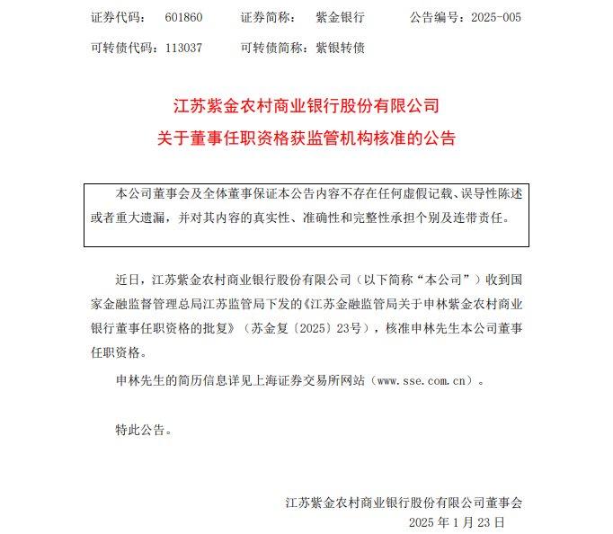 1月23日,紫金银行(601860)发布公告称,近日,公司收到国家金融监督管理总局江苏监管局下发的《江苏金融监管局关于申林紫金农村商业银行董事任职资格的批复》(苏金复〔2025〕23号),核准申林先生本公司董事任职资格。