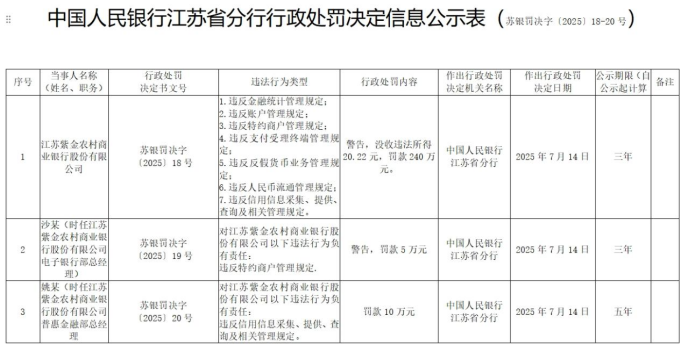 7月18日,中国人民银行江苏省分行披露的行政处罚信息显示,紫金银行因违反金融统计管理规定、账户管理规定、特约商户管理规定等七项违法行为,被处以警告,没收违法所得20.22元,并罚款240万元。