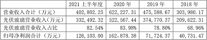在公司整体营收中,光伏玻璃所占比例呈上涨趋势。2018年,光伏玻璃营收占比还不足70%,两年时间过去,此比例已经突破了80%。2021上半年度,公司实现营业收入40.28亿元,其中光伏玻璃独自贡献33.25亿元,占比高达82.54%,可谓一骑绝尘。