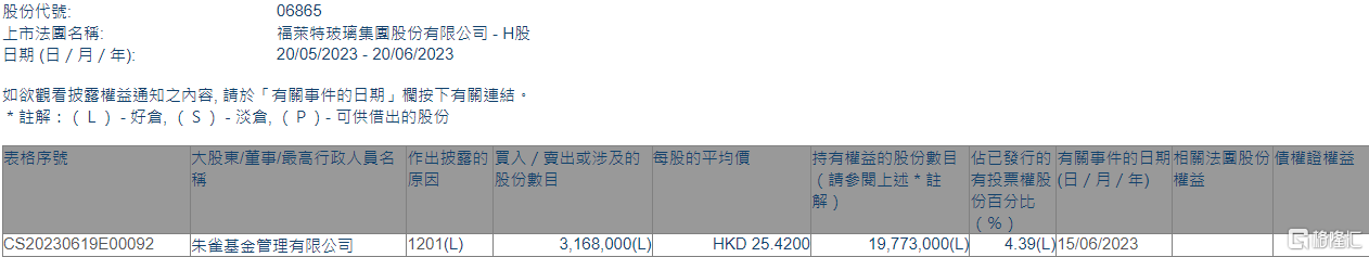 格隆汇6月20日丨根据联交所最新权益披露资料显示,2023年6月15日,福莱特玻璃(06865.HK)遭朱雀基金管理有限公司在场内以每股均价25.42港元减持316.8万股,涉资约8053.06万港元。