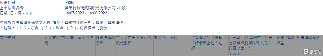 根据联交所最新权益披露资料显示,2023年8月7日,福莱特玻璃(06865.HK)遭JPMorgan Chase & Co.以每股均价23.8956港元减持好仓80.67万股,涉资约1927.7万港元。