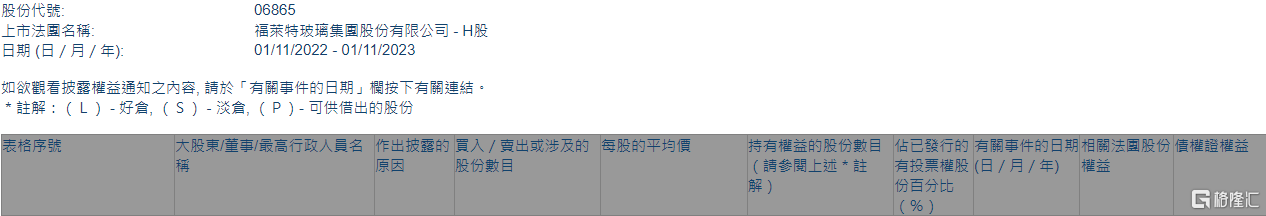 格隆汇11月1日丨根据联交所最新权益披露资料显示,2023年10月25日,福莱特玻璃(06865.HK)获JPMorgan Chase & Co.以每股均价15.2957港元增持好仓170.8万股,涉资约2612.5万港元。