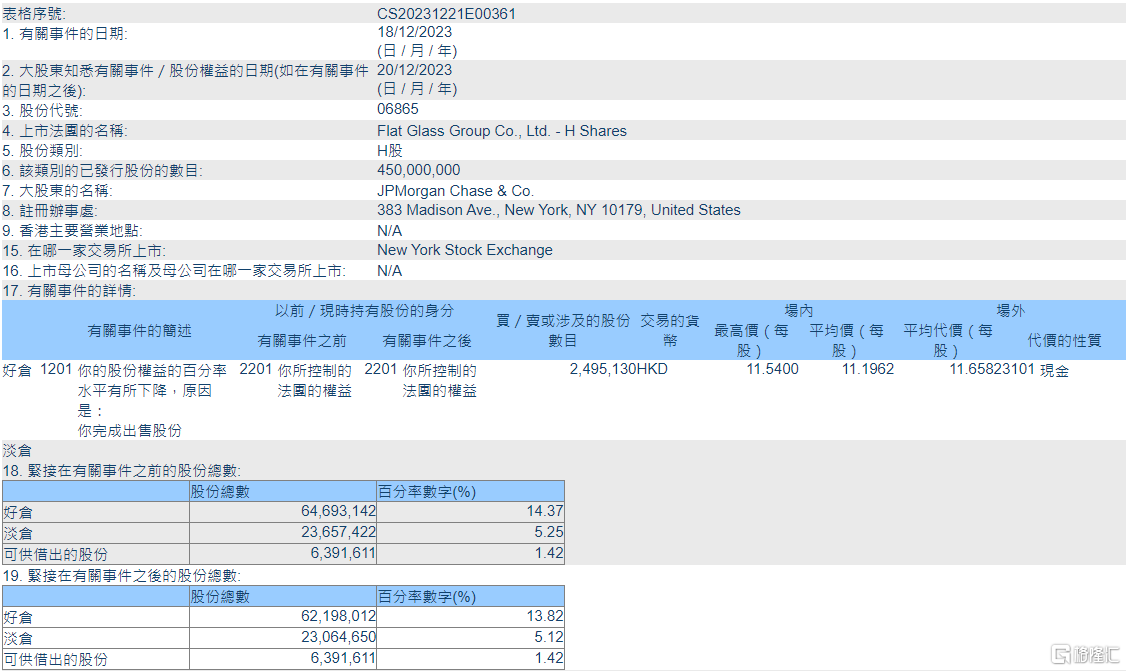 格隆汇12月22日丨根据联交所最新权益披露资料显示,2023年12月18日,福莱特玻璃(06865.HK)遭JPMorgan Chase & Co.以每股均价11.1962港元减持好仓249.51万股,涉资约2793.6万港元。