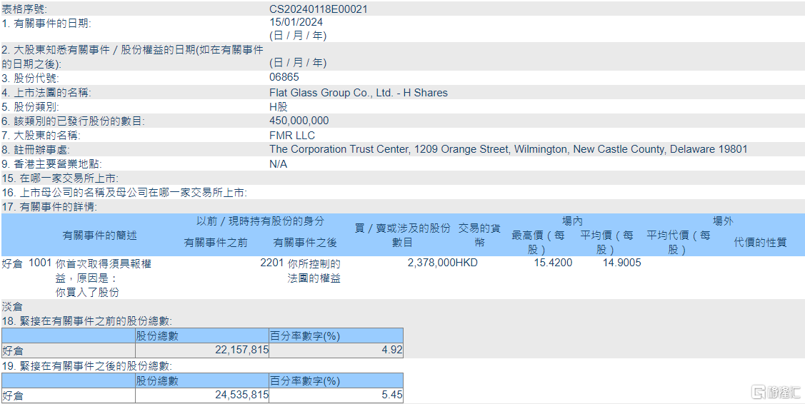 格隆汇1月19日丨根据联交所最新权益披露资料显示,2024年1月15日,福莱特玻璃(06865.HK)获FMR LLC在场内以每股均价14.9005港元增持237.8万股,涉资约3543.34万港元。