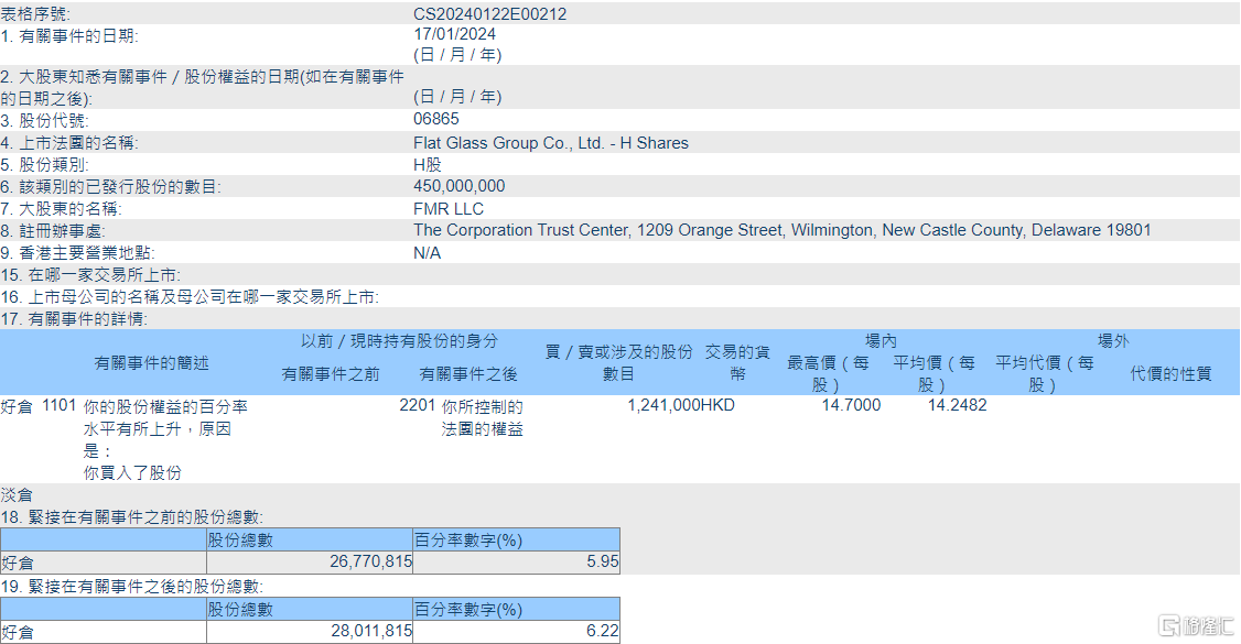 格隆汇1月23日丨根据联交所最新权益披露资料显示,2024年1月17日,福莱特玻璃(06865.HK)获FMR LLC在场内以每股均价14.2482港元增持124.1万股,涉资约1768.2万港元。