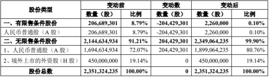 本次解除限售前,福莱特总股本2,351,324,235股,其中有限售条件股份206,689,301股,无限售条件股份2,144,634,934股。本次解除限售后,福莱特总股本2,351,324,235股,其中有限售条件股份2,260,000股。无限售条件股份2,349,064,235股。