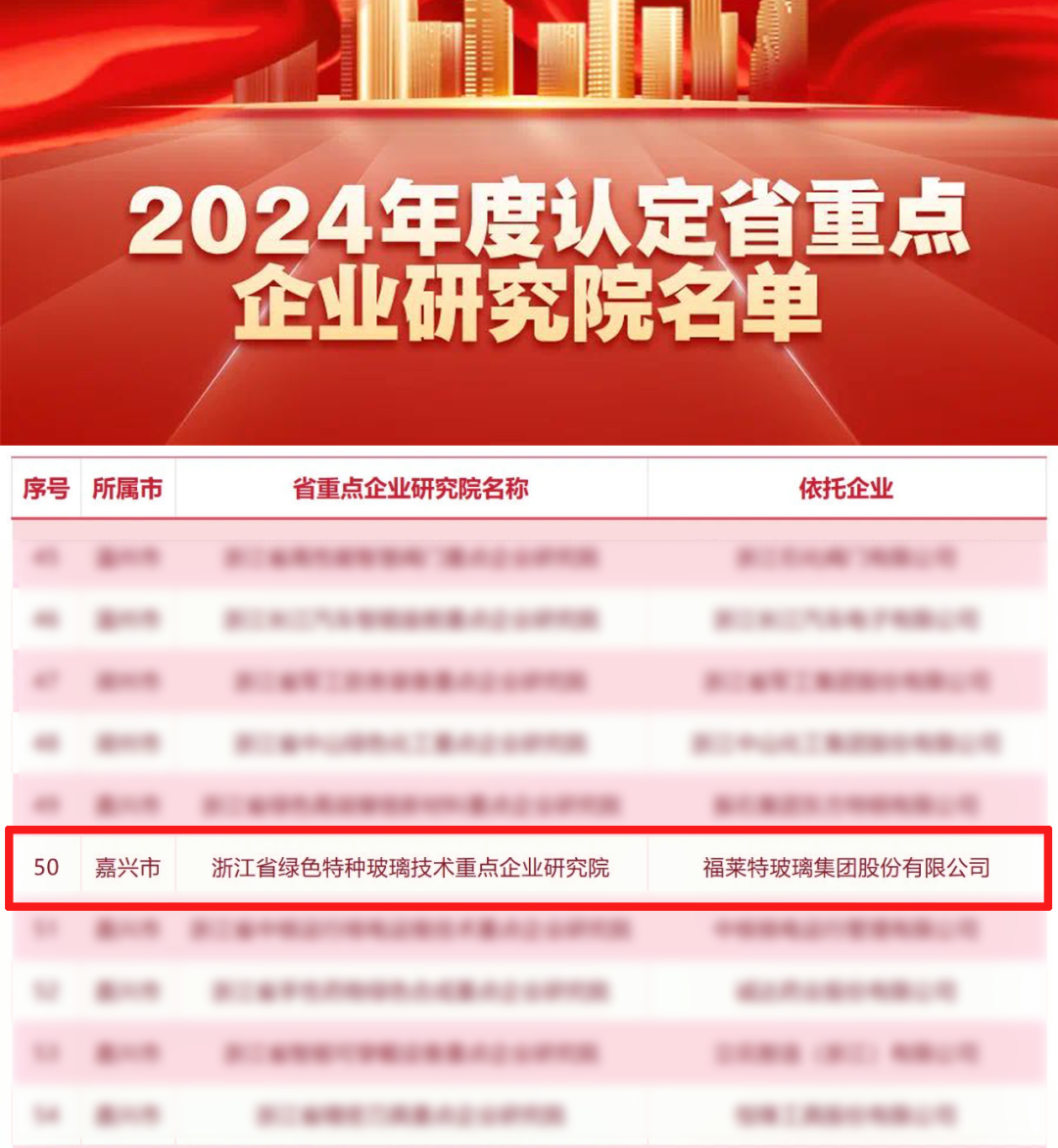 近日,浙江省经信厅公布2024年新认定省重点企业研究院名单,福莱特集团“浙江省绿色特种玻璃技术重点企业研究院”成功入选,充分彰显公司在创新领域的实力以及行业领先地位。